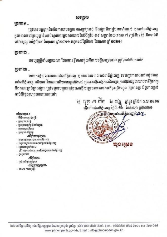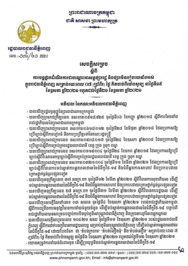 រដ្ឋបាលរាជធានីភ្នំពេញ នាថ្ងៃទី១៤ ខែឧសភា ឆ្នាំ២០២១នេះ បានសម្រេចបន្តផ្អាកដំណើរការជាបណ្ដោះអាសន្នផ្សាររដ្ឋ និងផ្សារមិនរៀបរយទាំងអស់ សម្រាប់រយៈពេល ៧ថ្ងៃ គិតចាប់ពីម៉ោងសូន្យ នាថ្ងៃទី១៥ រហូតដល់ ថ្ងៃទី២១ ខែឧសភា ឆ្នាំ២០២១។ សូមអានខ្លឹមសារទាំងស្រុងដូចខាងក្រោម៖