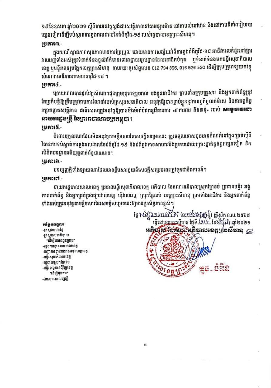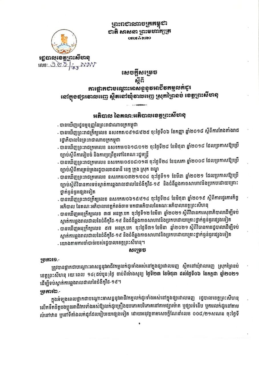 យោងតាមការចេញផ្សាយនៅលើគេហទំព័រហ្វេសប៊ុក រដ្ឋបាលខេត្តព្រះសីហនុ បានឱ្យដឹងថា រដ្ឋបាលខេត្តបានចេញសេចក្ដីសម្រេច ស្ដីពីការផ្អាកជាបណ្តោះអាសន្ននូវអាជីវកម្មលក់ដូរទាំងអស់នៅក្នុងផ្សារវាលរេញ ស្ថិតនៅឃុំវាលរេញ ស្រុកព្រៃនប់ ខេត្តព្រះសីហនុ រយៈពេល ១៤ថ្ងៃ (ចាប់ពីម៉ោងសូន្យ ថ្ងៃទី២៣ ខែមិថុនា ដល់ថ្ងៃទី០៦ ខែកក្កដា ឆ្នាំ២០២១ ដើម្បីទប់ស្កាត់ការរីករាលដាលវីរុស កូវីដ-១៩។
