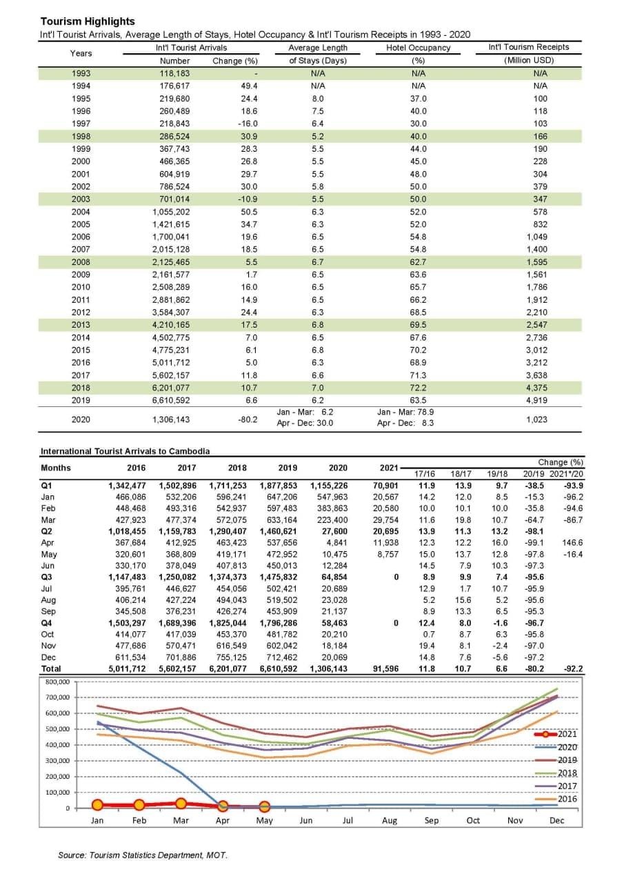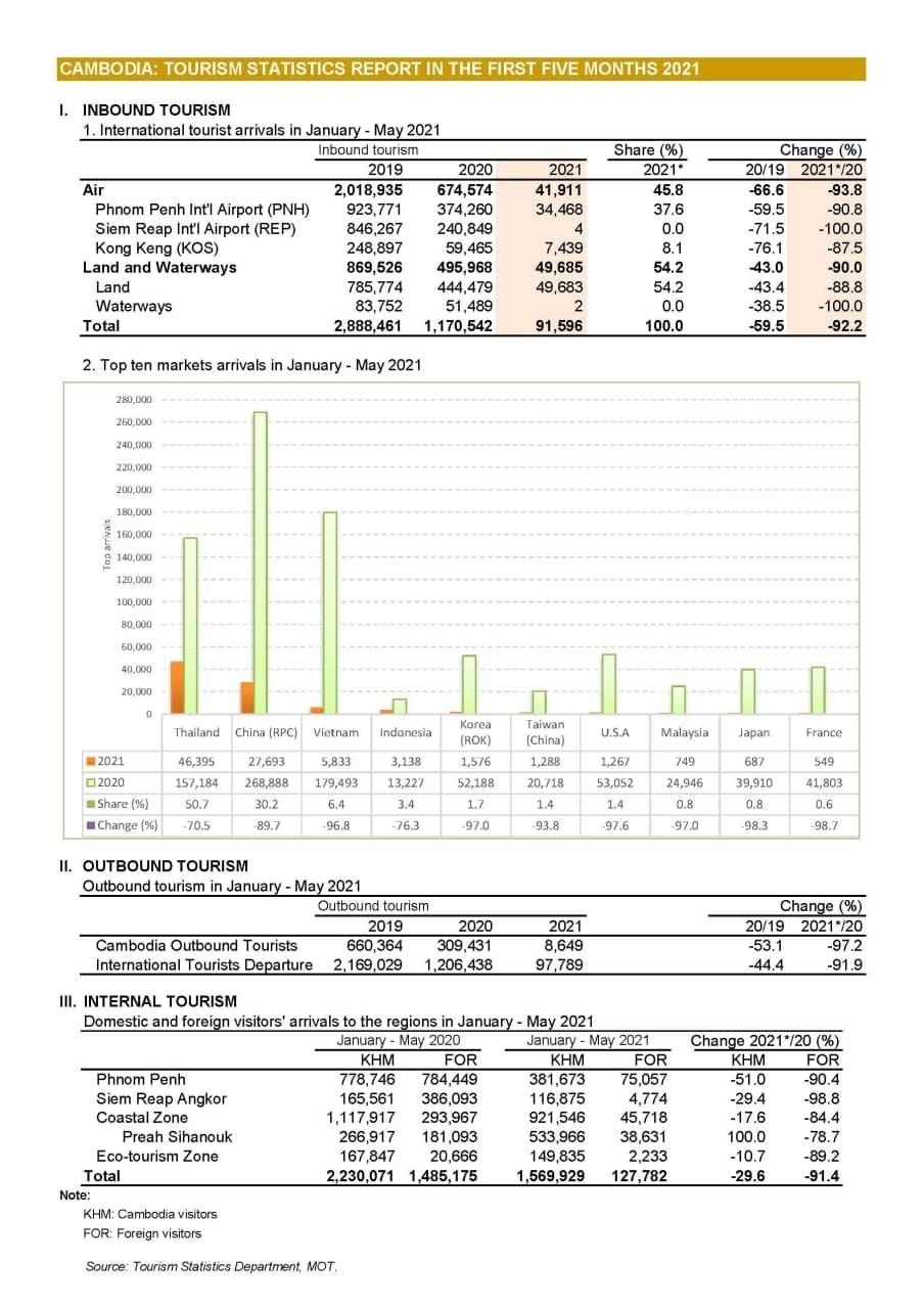 របាយការណ៍បានឱ្យដឹងថា ក្នុងរយៈពេលប្រាំខែ នៃឆ្នាំ២០២១ (ខែមករា-ខែឧសភា) ភ្ញៀវទេសចរអន្តរជាតិដែលបានធ្វើដំណើរចូលមកកាន់ប្រទេសកម្ពុជា មានចំនួនសរុប ៩១,៥៩៦ នាក់ ធ្លាក់ចុះ ៩២.២ ភាគរយ បើធៀបក្នុងរយៈពេលដូចគ្នានៅឆ្នាំ២០២០។
