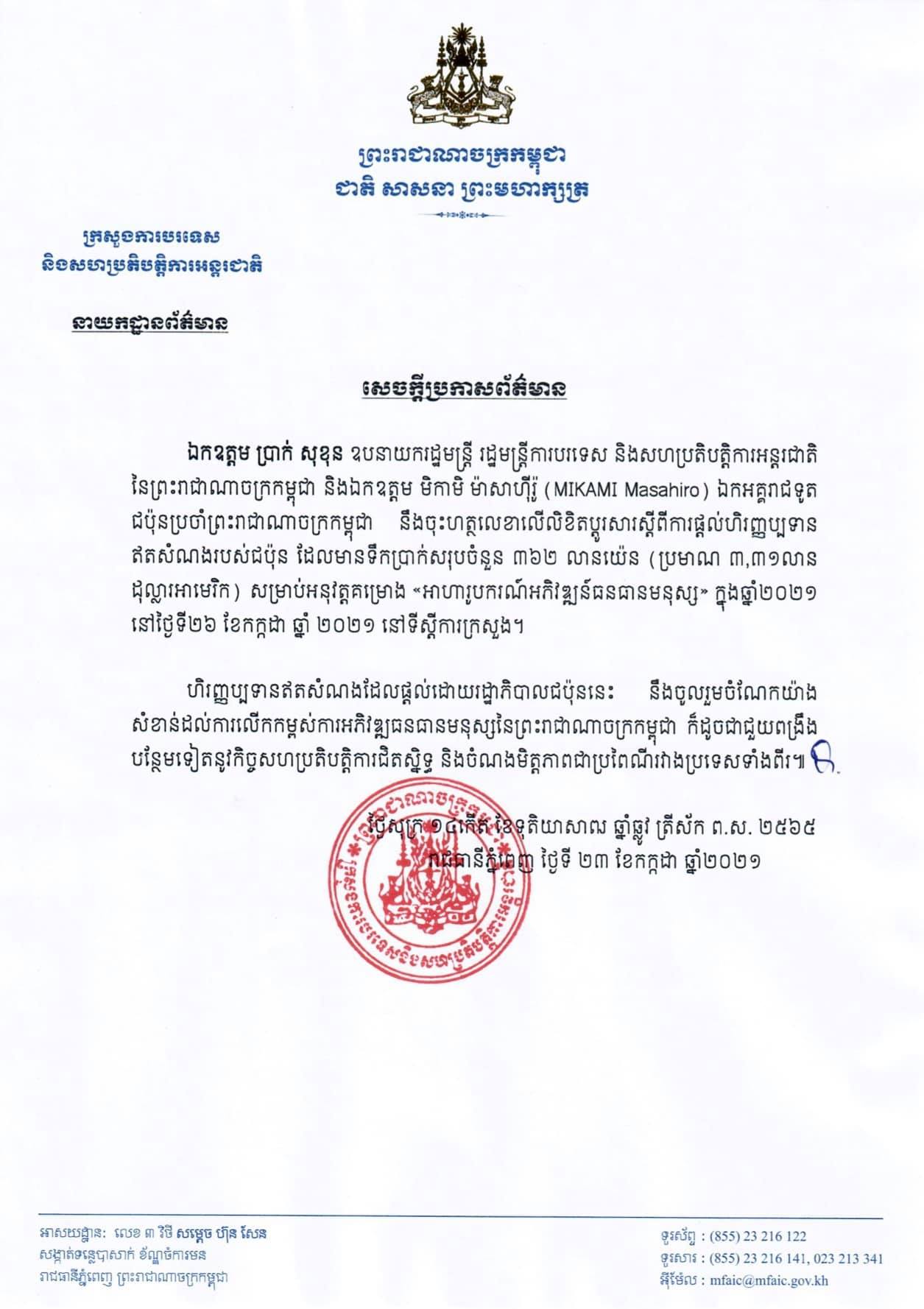 សេចក្ដីប្រកាសព័ត៌មានដដែលបានបន្តថា ឯកឧត្តម ប្រាក់ សុខុន ឧបនាយករដ្ឋមន្ត្រី រដ្ឋមន្ត្រីការបរទេស និងសហប្រតិបត្តិការអន្តរជាតិកម្ពុជា និងឯកឧត្តម មិកាមិ ម៉ាសាហ៊ីរ៉ូ (MIKAMI Masahiro) ឯកអគ្គរាជទូតជប៉ុនប្រចាំកម្ពុជា នឹងចុះហត្ថលេខាលើលិខិតប្ដូរសារ ស្តីពីការផ្តល់ហិរញ្ញប្បទានឥតសំណង របស់ជប៉ុននេះ នៅថ្ងៃទី២៦ ខែកក្កដា ឆ្នាំ២០២១ នាទីស្តីការក្រសួង ។