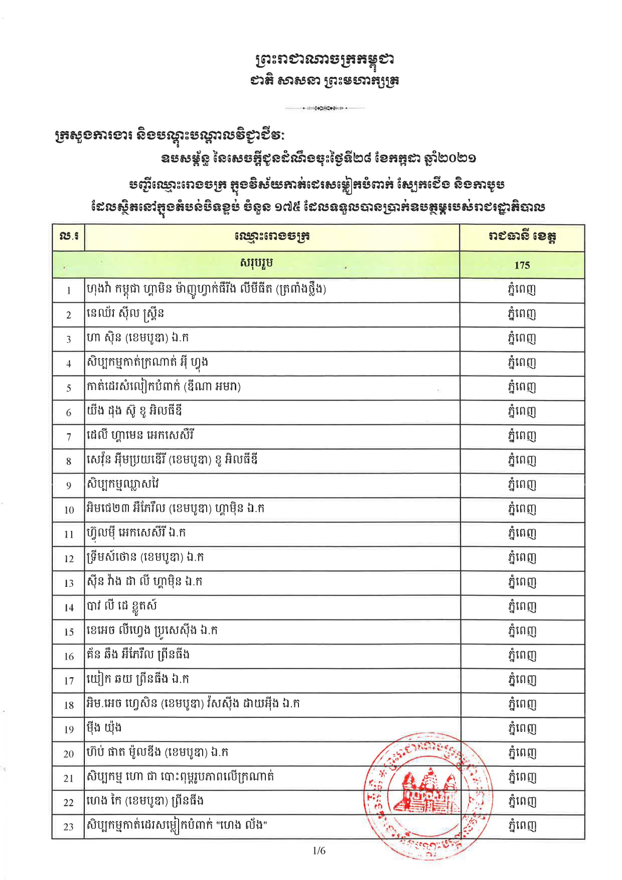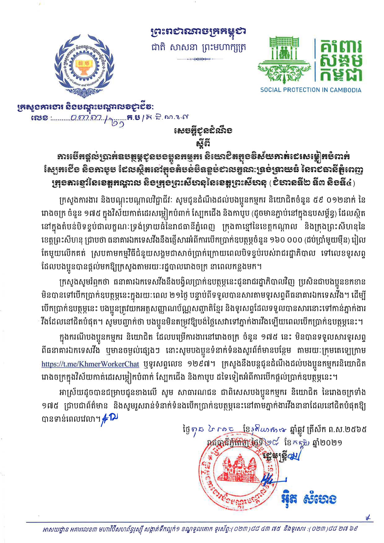 ក្រសួងការងារ និងបណ្តុះបណ្តាលវិជ្ជាជីវៈ បានជូនដំណឹងដល់បងប្អូនកម្មករ និយោជិតចំនួន ៥៩, ០១២នាក់ នៃ រោងចក្រចំនួន ១៧៥ ក្នុងវិស័យកាត់ដេរសម្លៀកបំពាក់ ស្បែកជើង និងកាបូប (ដូចមានភ្ជាប់នៅក្នុងឧបសម្ព័ន្ធ ដែលស្ថិត នៅក្នុងតំបន់បិទខ្ទប់ជាលក្ខណៈទ្រង់ទ្រាយធំនៃរាជធានីភ្នំពេញ ក្រុងតាខ្មៅនៃខេត្តកណ្តាល និងក្រុងព្រះសីហនុនៃ ខេត្តព្រះសីហនុឲ្យដឹងថា ធនាគារឯកទេសវីងនឹងផ្ញើសារអំពីការបើកប្រាក់ឧបត្ថម្ភចំនួន ១៦០ ០០០ (ដប់ប្រាំមួយម៉ឺន) រៀល តែមួយលើកគត់ ស្របតាមកម្មវិធីជំនួយសង្គមជាសាច់ប្រាក់ក្រោយពេលបិទខ្ទប់របស់រាជរដ្ឋាភិបាល ទៅលេខទូរសព្ទ ដែលបងប្អូនបានផ្តល់មកឱ្យក្រសួងតាមរយៈរដ្ឋបាលរោងចក្រ ពេលកន្លងមក។