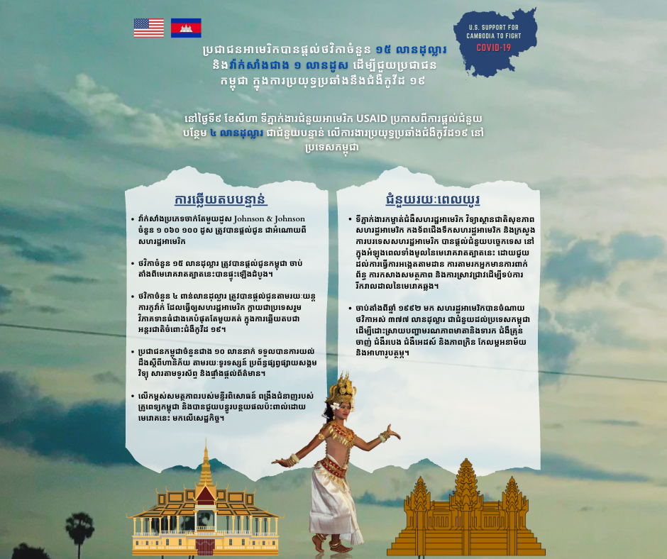 យោងតាមការចេញផ្សាយរបស់ស្ថានទូតសហរដ្ឋអាមេរិកប្រចាំនៅកម្ពុជានៅថ្ងៃទី០៩ ខែសីហា ឆ្នាំ២០២១ បានឱ្យដឹងថា សហរដ្ឋអាមេរិក តាមរយៈទីភ្នាក់ងារជំនួយអាមេរិក USAID សូមប្រកាសការផ្តល់ជំនួយបន្ថែមចំនួន ៤ លានដុល្លារ ជាជំនួយសម្រាប់គ្រាបន្ទាន់ ទាក់ទងនឹងជំងឺកូវីដ ១៩ សម្រាប់ប្រទសកម្ពុជា។