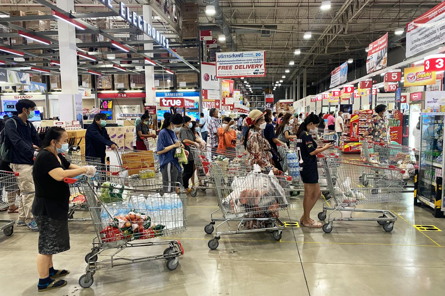 ទន្ទឹមនឹងនេះដែរ លោក Supawut Chaiprasitkul អនុប្រធានផ្សារទំនើបនិងម្ហូបអាហារនៅ The Mall Group Co បាននិយាយថាផលិតផលស្រស់ៗ និងអាហារកញ្ចប់សម្រាប់ចម្អិតដោយខ្លួនឯងនៅផ្ទះ ត្រូវបានលក់ដាច់គ្មានសល់នៅផ្សារទំនើបរបស់ខ្លួនក្នុងរយៈពេលប៉ុន្មានសប្តាហ៍ថ្មីៗនេះ។ លោកបានបន្តថា ផលិតផលខ្លះអស់ពីស្តុកដោយសាររោងចក្រត្រូវបានបិទព្រោះតែការឆ្លងមេរោគ ហើយកង្វះផលិតផលបានកើតឡើងចាប់តាំងពីពាក់កណ្តាលខែកក្កដា នៅពេលដែលអត្រាឆ្លងកាន់តែអាក្រក់​ ហើយវិធានការបិទទ្វារនិងបំរាមគោចរត្រូវបានពង្រីក។