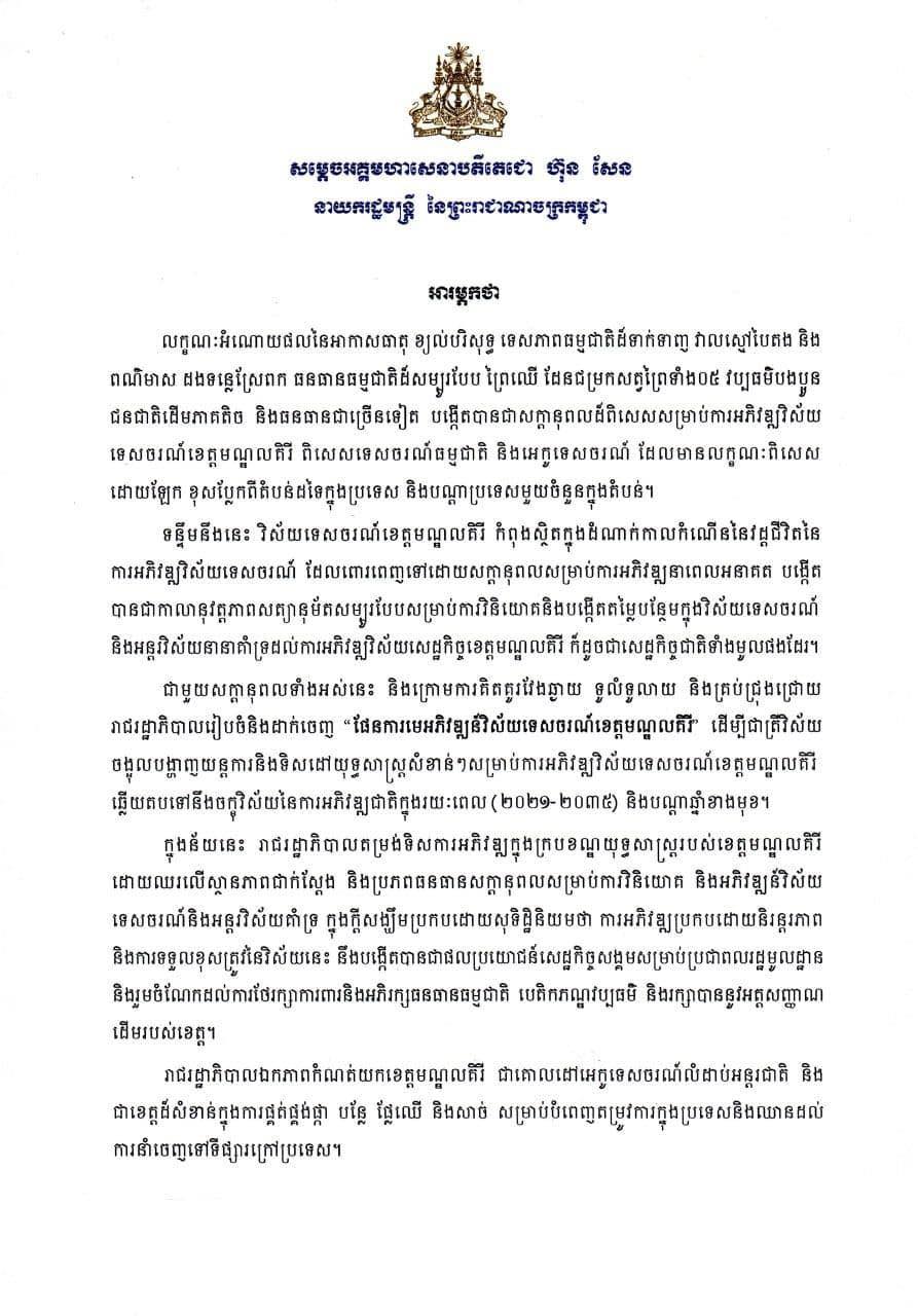 គួរបញ្ជាក់ថា រាជរដ្ឋាភិបាលបានបង្កើតគណៈកម្មការអន្តរក្រសួង ដើម្បីសិក្សារៀបចំផែនការមេអភិវឌ្ឍន៍វិស័យទេសចរណ៍នៅខេត្តកែប និងខេត្តមណ្ឌលគិរី តាមរយៈលិខិតលេខ ០១ សសរ ចុះថ្ងៃទី១៥ ខែមករា ឆ្នាំ២០២០ ដែលមានឯកឧត្តម ថោង ខុន រដ្ឋមន្ត្រីក្រសួងទេសចរណ៍ ជាប្រធាន៕