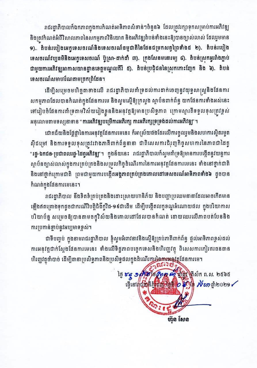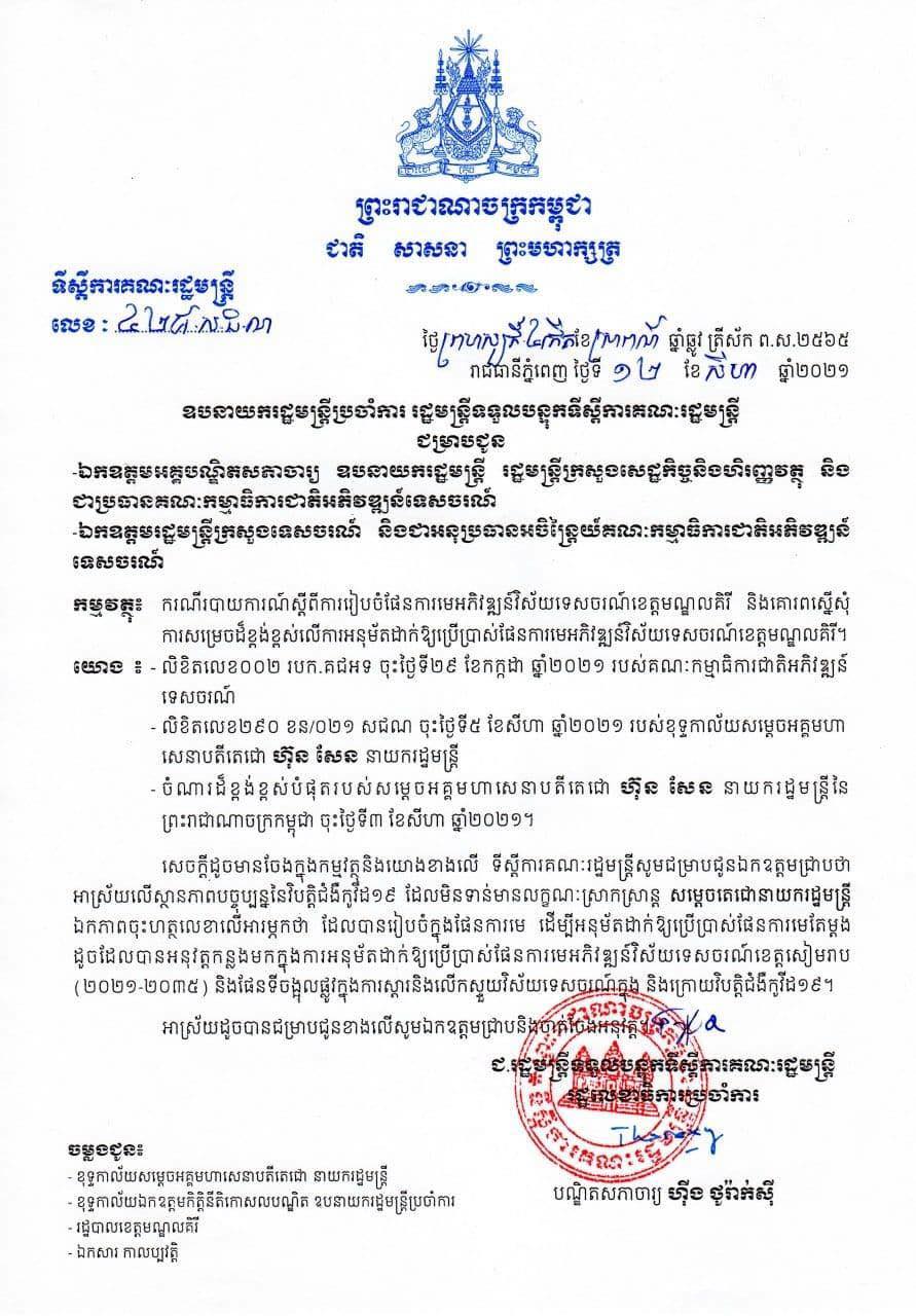 យោងតាមការចុះផ្សាយរបស់ក្រសួងទេសចរណ៍មុននេះបន្តិចបានឱ្យដឹងថា រាជរដ្ឋាភិបាលបានអនុម័ត ដាក់ឲ្យប្រើប្រាស់ជាផ្លូវការនូវ ផែនការមេអភិវឌ្ឍន៍វិស័យទេសចរណ៍ ខេត្តមណ្ឌលគិរី សម្រាប់ឆ្នាំ២០២១-២០៣៥ តាមរយៈលិខិតរបស់ ទីស្តីការគណៈរដ្ឋមន្រ្តី លេខ ៤២៨ សជណ ចុះថ្ងៃទី១២ ខែសីហា ឆ្នាំ២០២១ ខណៈសម្តេចតេជោនាយករដ្ឋមន្រ្តី បានផ្តល់ហត្ថលេខាលើអារម្ភកថា នៃផែនការមេនេះផងដែរ ដើម្បីបង្ហាញពីការគាំទ្រយ៉ាងពេញលេញ ដល់ការអនុវត្តផែនការមេដ៏មានសារៈសំខាន់នេះ។