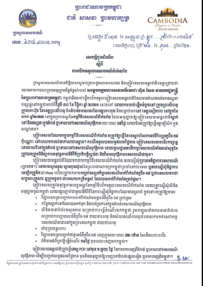 ក្ដៅៗ! កម្ពុជាប្រកាសបើកទទួលទេសចរណ៍វ៉ាក់សាំង បើកដំបូងនៅក្រុងព្រះសីហនុ ក្រុងកោះរ៉ុង និងនៅតារាសាគរនៃខេត្តកោះកុង
