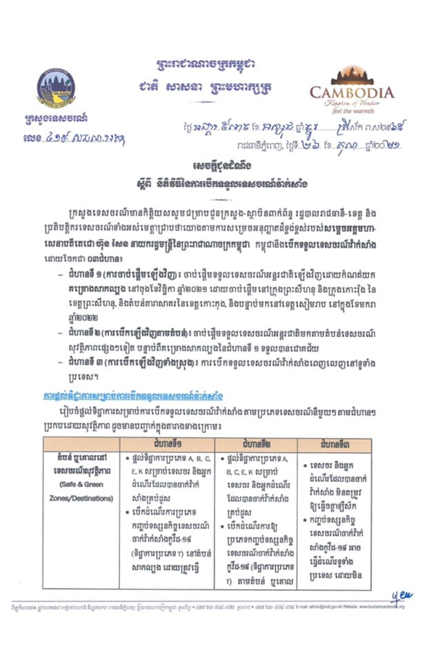 យោងតាមការបង្ហោះនៅលើផេកសម្ដេចតេជោ ហ៊ុន សែន នាយករដ្ឋមន្រ្តីនៃព្រះរាជាណាចក្រកម្ពុជា មុននេះបន្តិចបាន​ឱ្យដឹងថា បន្ទាប់ពីរងនូវវិបត្តិជំងឺកូវីដ-១៩ជាងពីរឆ្នាំមកនេះ ទីបំផុត ប្រទេសកម្ពុជាបានប្រកាសបើកទទួលទេសចរអន្តរជាតិឡើងវិញ ក្រោមទម្រង់ជា «ទេសចរណ៍វ៉ាក់សាំង»។