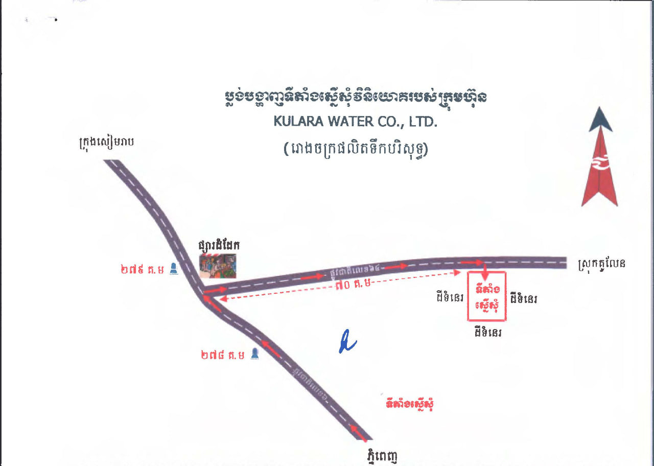 ១៣-KULARA WATER CO., LTD: គម្រោងបង្កើតរោងចក្រផលិតទឹកបរិសុទ្ធ ដែលមានទីតាំងវិនិយោគស្ថិតនៅភូមិស្រយង់ត្បូង ឃុំស្រយង់ ស្រុកគូលែន ខេត្តព្រះវិហារ មានទុនវិនិយោគប្រមាណ ៥,៦លានដុល្លារអាមេរិក និងអាចបង្កើតការងារបានចំនួន ១០៧កន្លែង។