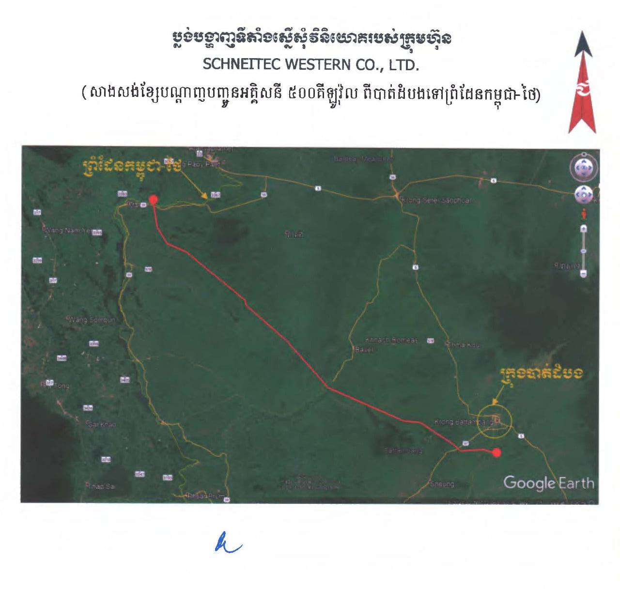 ៣-SCHNEITEC WESTERN CO., LTD: គម្រោងសាងសង់ខ្សែបណ្តាញបញ្ជូនអគ្គិសនី ៥០០គីឡូវ៉ុល ពីបាត់ដំបងទៅព្រំដែនកម្ពុជា-ថៃ មានទុនវិនិយោគប្រមាណ ១១១លានដុល្លារអាមេរិក និងអាចបង្កើតការងារបានចំនួន ៧៧កន្លែង។