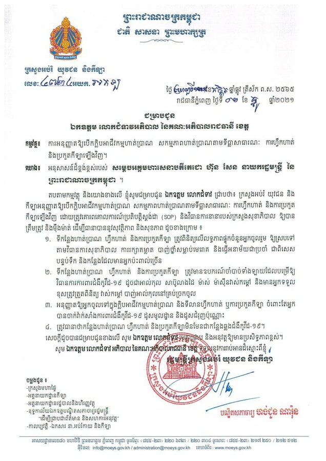 យោងតាមការចុះផ្សាយរបស់ក្រសួងព័ត៌មានបានឱ្យដឹងថា ឯកឧត្តមបណ្ឌិតសភាចារ្យ ហង់ជួន ណារ៉ុន រដ្ឋមន្រ្ដីក្រសួងអប់រំ យុវជន និងកីឡា បានអនុញ្ញាតឱ្យបើកក្លិបអាជីវកម្មហាត់ប្រាណ សកម្មភាពហាត់ប្រាណតាមទីធ្លាសាធារណៈ ការហ្វឹកហាត់ និងប្រកួតកីឡាឡើងវិញ ដោយត្រូវគោរពគោលការណ៍ប្រតិបត្តិស្តង់ដារ (SOP)។