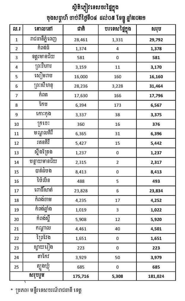 ក្រសួងទេសចរណ៍កាលពីថ្ងៃទី០៧ ខែធ្នូ ឆ្នាំ២០២១ បានចេញផ្សាយថា ភ្ញៀវទេសចរផ្ទៃក្នុងនាចុងសប្តាហ៍ថ្ងៃទី៤-៥ ខែធ្នូ ឆ្នាំ២០២១ នៅទូទាំងប្រទេសទទួលបានភ្ញៀវសរុបមានចំនួន ១៨១,០២៤ នាក់ ក្នុងនោះភ្ញៀវជាតិ ១៧៥,៧១៦ នាក់ និងភ្ញៀវបរទេសផ្ទៃក្នុង ៥,៣០៨ នាក់ នេះបើតាមឯកឧត្តម ថោង ខុន រដ្ឋមន្ត្រីក្រសួងទេសចរណ៍។