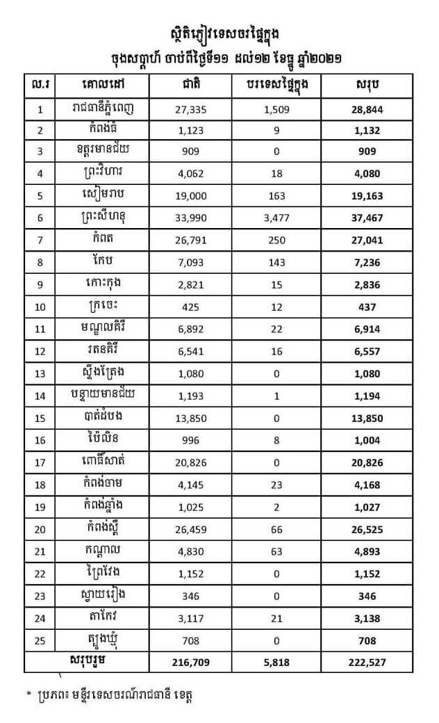 យោងតាមការចុះផ្សាយរបស់ក្រសួងទេសចរណ៍នាថ្ងៃ ១៣ ខែធ្នូ ឆ្នាំ២០២១ នេះ ឯកឧត្តម ថោង ខុន រដ្ឋមន្រ្តីក្រសួងទេសចរណ៍ បានជំរុញវិស័យឯកជនត្រៀមទទួលភ្ញៀវនៅពេលឆ្លងឆ្នាំ ខណៈនៅចុងសប្ដាហ៍ទី២នៃខែធ្នូ ឆ្នាំ២០២១នេះ កំណើនភ្ញៀវទេសចរផ្ទៃក្នុងគឺមានកើនឡើងលើសសប្ដាហ៍មុនៗទៀត ដោយភ្ញៀវទេសចរសរុបមានចំនួន ២២២,៥២៧ នាក់ ក្នុងនោះភ្ញៀវជាតិ ២១៦,៧០៩ នាក់ និងភ្ញៀវបរទេសផ្ទៃក្នុង ៥,៨១៨ នាក់។