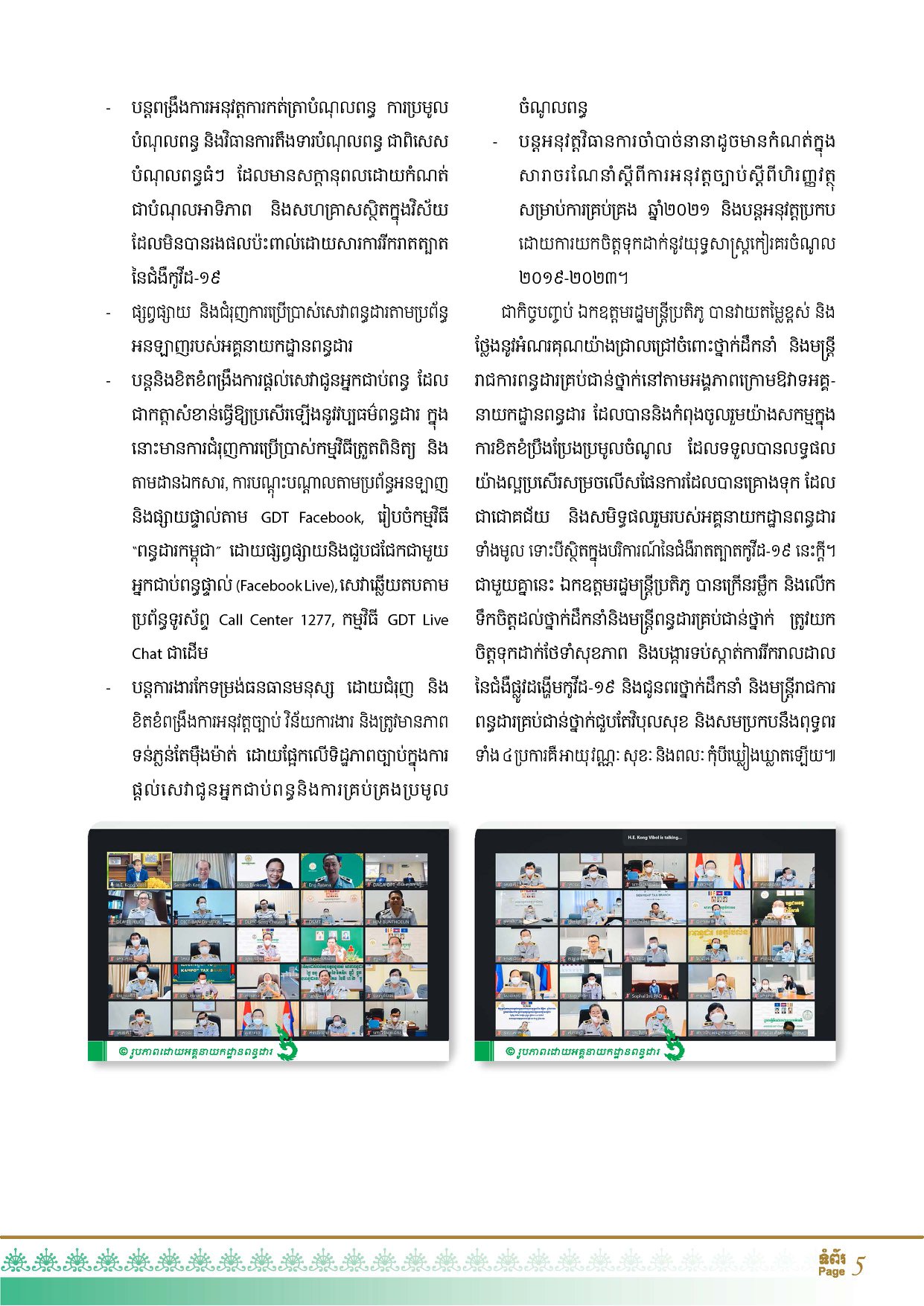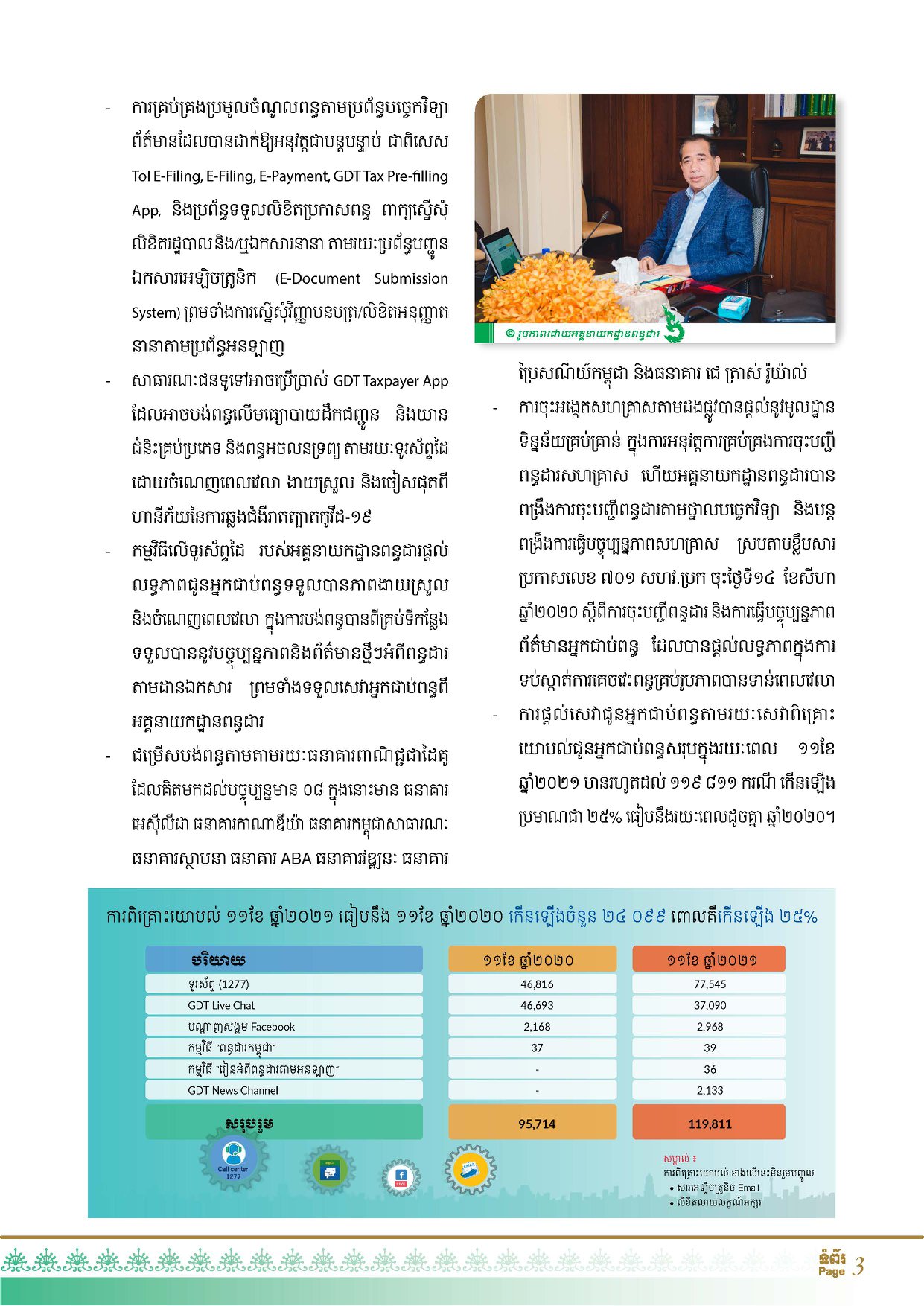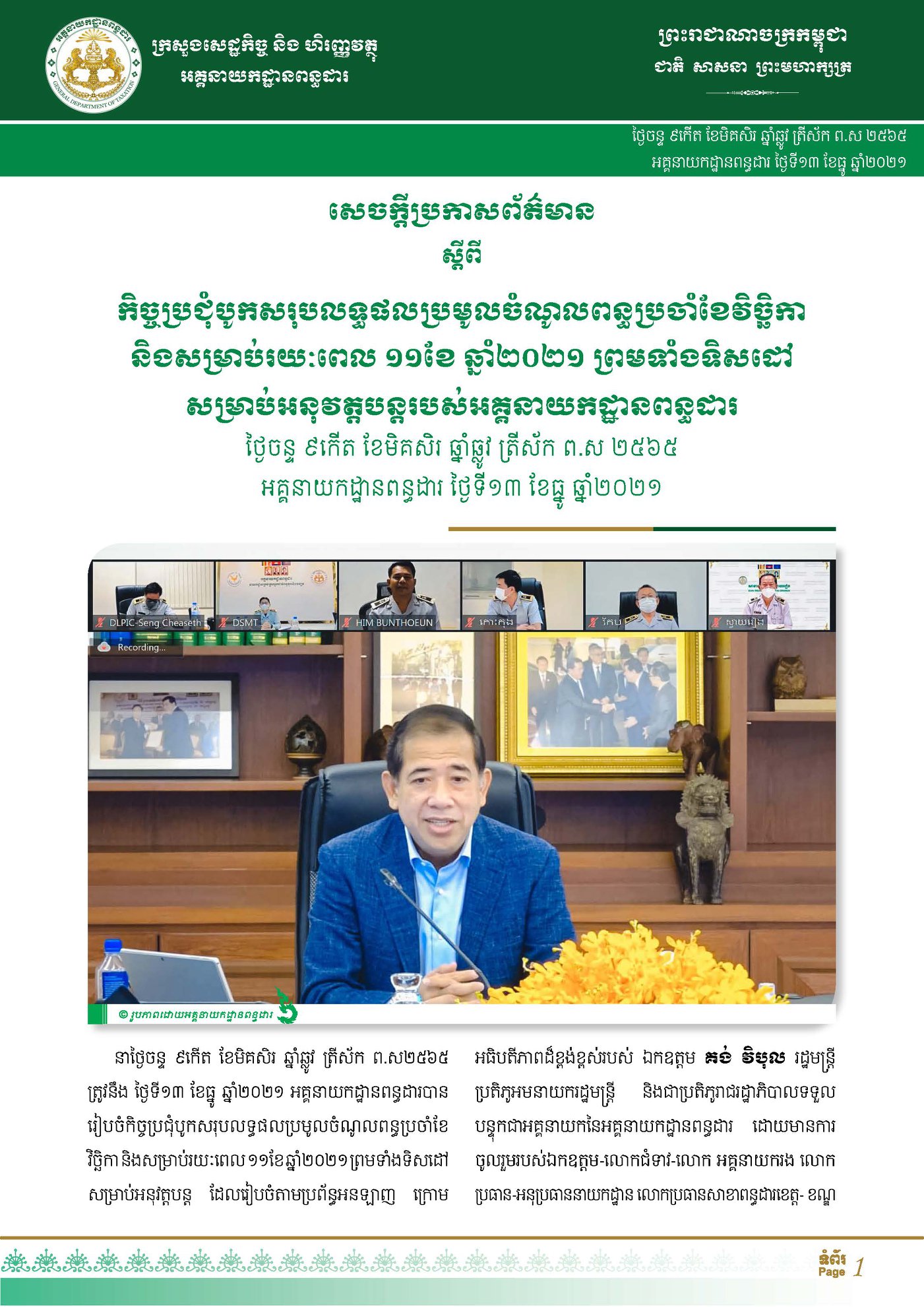 រយៈពេល ១១ខែនៃឆ្នាំ២០២១នេះ អគ្គនាយកដ្ឋានពន្ធដារប្រមូលពន្ធ-អាករបានចំនួន ១០ ៣៦៨,៥០ ប៊ីលានរៀល (ប្រមាណជា ២​ ៥៦០,១២ លានដុល្លារអាមេរិក) ស្មើនឹង ១១៤,១៣% នៃផែនការច្បាប់ហិរញ្ញវត្ថុសម្រាប់ការគ្រប់គ្រងឆ្នាំ២០២១។ តួលេខនេះត្រូវបានបង្ហាញដោយ ឯកឧត្តម គង់ វិបុល ប្រតិភូរាជរដ្ឋាភិបាលទទួលបន្ទុកជាអគ្គនាយកនៃអគ្គនាយកដ្ឋានពន្ធដារ នៅក្នុងកិច្ចប្រជុំបូកសរុបលទ្ធផលប្រមូលចំណូលពន្ធប្រចាំខែវិច្ឆិកា និងសម្រាប់រយៈពេល ១១ខែ ឆ្នាំ២០២១ ព្រមទាំងទិសដៅសម្រាប់អនុវត្តបន្ត របស់អគ្គនាយដ្ឋានពន្ធដារ តាមរយៈប្រព័ន្ធអនឡាញ កាលពីថ្ងៃសុក្រ ទី១៣ ខែធ្នូ ឆ្នាំ២០២១។