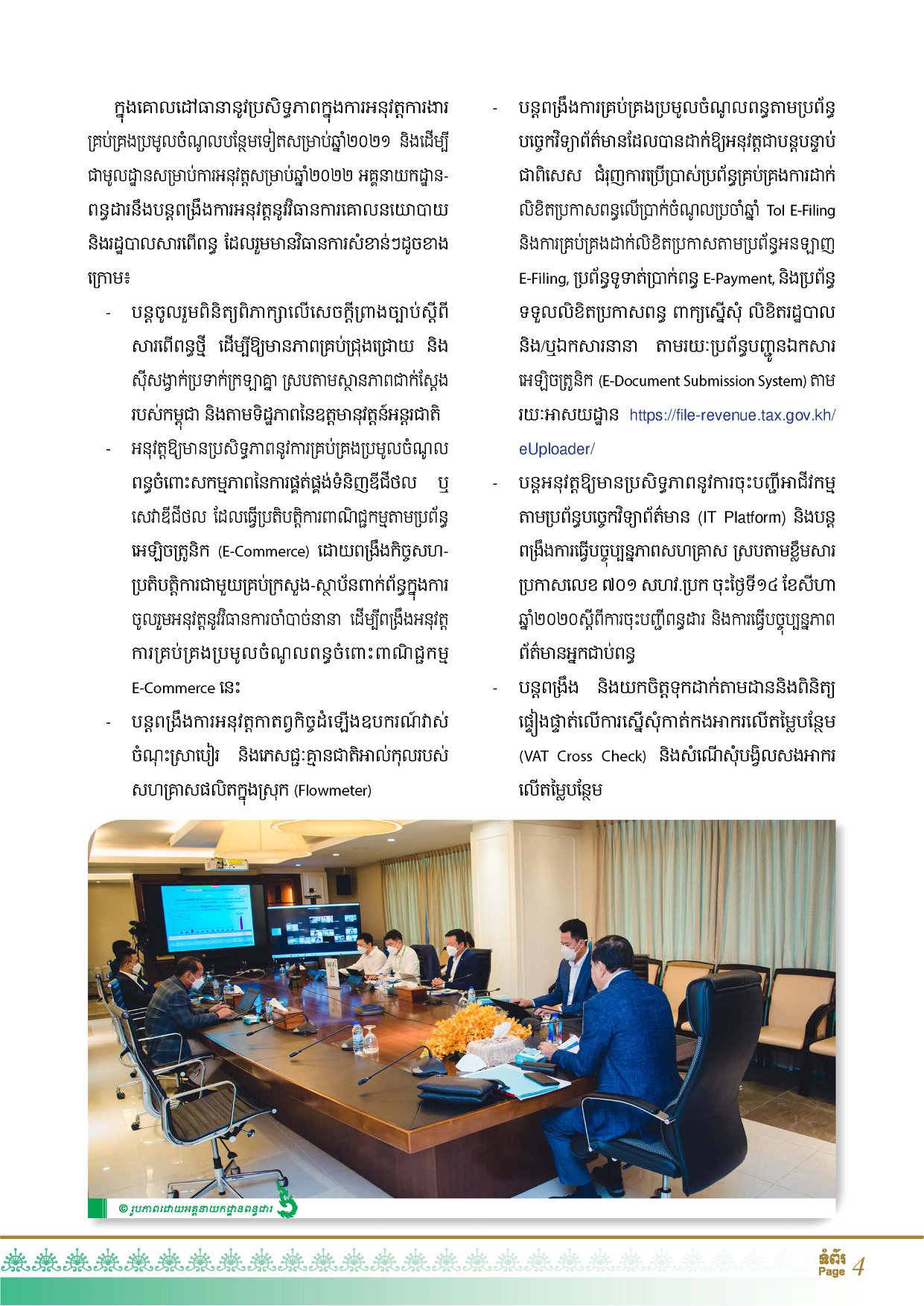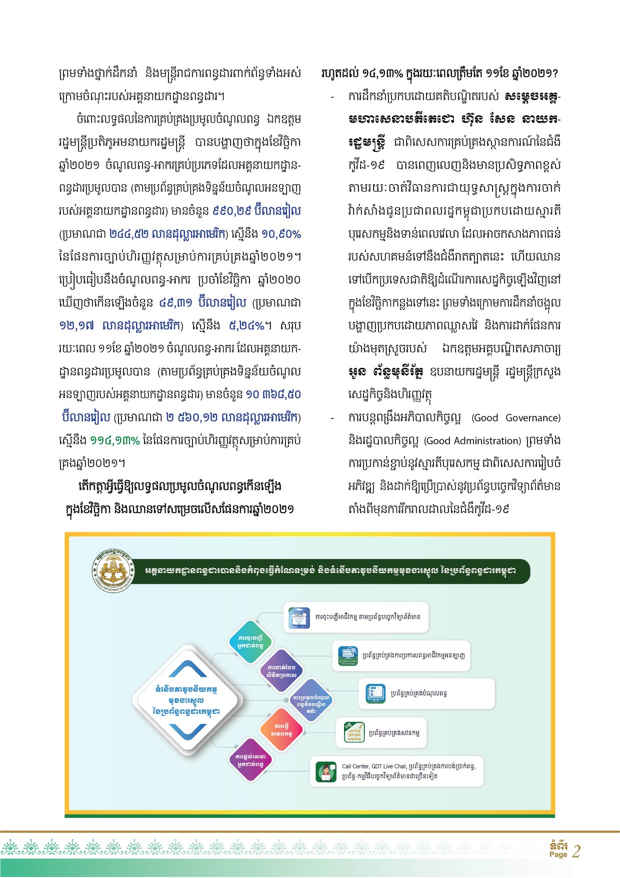 សេចក្តីប្រកាសព័ត៌មានរបស់អគ្គនាយកដ្ឋានពន្ធដារ កាលពីថ្ងៃទី១៣ធ្នូ ឆ្នាំ២០២១ ក៏បានបញ្ជាក់ថា ចំណូលដែលប្រមូលបាននេះ គឺលើសផែនការរហូតដល់ ១៤,១៣ %។