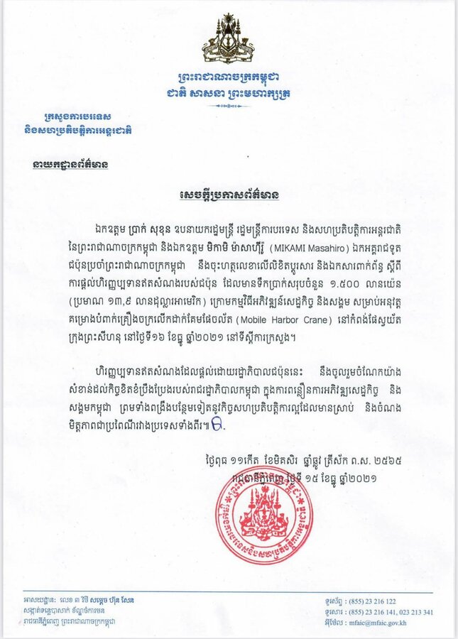 យោងតាមការចុះផ្សាយរបស់ក្រសួងព័ត៌មានបានឱ្យដឹងថា ឯកឧត្ដម ប្រាក់ សុខុន ឧបនាយករដ្ឋមន្ត្រី រដ្ឋមន្ត្រីការបរទេស និងសហប្រតិបត្តិការអន្តរជាតិ នៃព្រះរាជាណាចក្រកម្ពុជា និងឯកឧត្ដម មិកាមិ ម៉ាសាហ៊ីរ៉ូ (MIKAMI Masahiro) ឯកអគ្គរាជទូតជប៉ុនប្រចាំព្រះរាជាណាចក្រកម្ពុជា នឹងចុះហត្ថលេខាលើលិខិតប្ដូរសារ និងឯកសារពាក់ព័ន្ធ ស្ដីពីការផ្ដល់ហិរញ្ញប្បទានឥតសំណងរបស់ជប៉ុន ដែលមានទឹកប្រាក់សរុបចំនួន ១.៥០០ លានយ៉េន (ប្រមាណ ១៣,៩ លានដុល្លារអាមេរិក) ក្រោមកម្មវិធីអភិវឌ្ឍន៍សេដ្ឋកិច្ច និងសង្គម សម្រាប់អនុវត្តគម្រោងបំពាក់គ្រឿងចក្រលើកដាក់គែមផែចល័ត (Mobile Harbor Crane) នៅកំពង់ផែស្វយ័ត ក្រុងព្រះសីហនុ នៅថ្ងៃទី១៦ ខែធ្នូ ឆ្នាំ២០២១ នៅទីស្ដីការក្រសួង។
