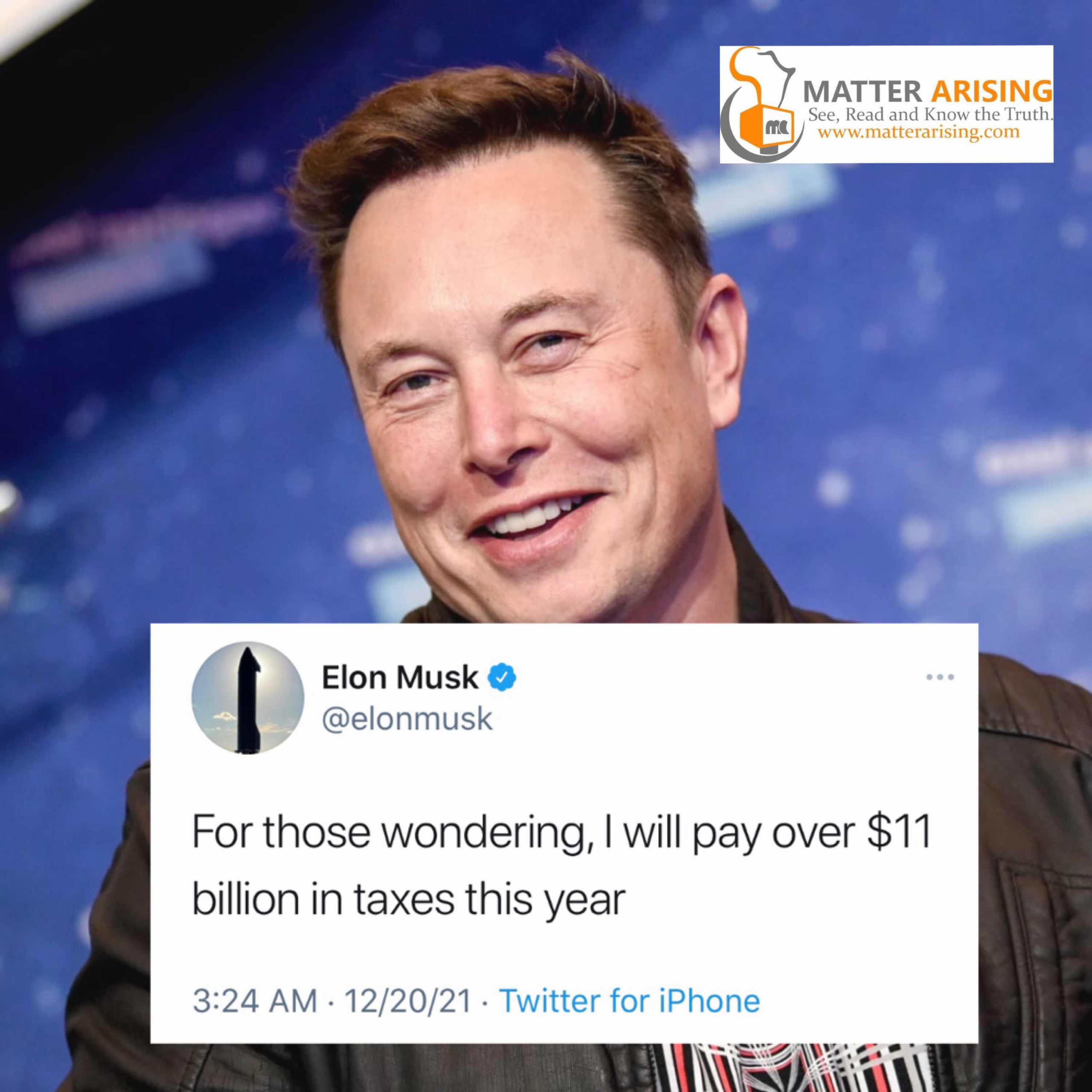 ស្ថាបនិកក្រុមហ៊ុន Tesla លោក Elon Musk កាលពីថ្ងៃអាទិត្យ បាននិយាយនៅគណនី Twitter ថា លោកនឹងបង់ពន្ធច្រើនជាង ១១ពាន់លានដុល្លារនៅឆ្នាំនេះ ហើយបង់ច្រើនជាងជនជាតិអាមេរិកណាទាំងអស់ ក្នុងប្រវត្តិសាស្រ្តនៅឆ្នាំនេះ។ កាលពីសប្តាហ៍មុន មហាសេដ្ឋីរូបនេះបានឈ្លោះជាមួយសមាជិកព្រឹទ្ធសភា Elizabeth Warren (D-Mass.) នៅលើ Twitter បន្ទាប់ពីនាងបានចោទប្រកាន់គាត់ថាមិនបានបង់ពន្ធគ្រប់គ្រាន់។
