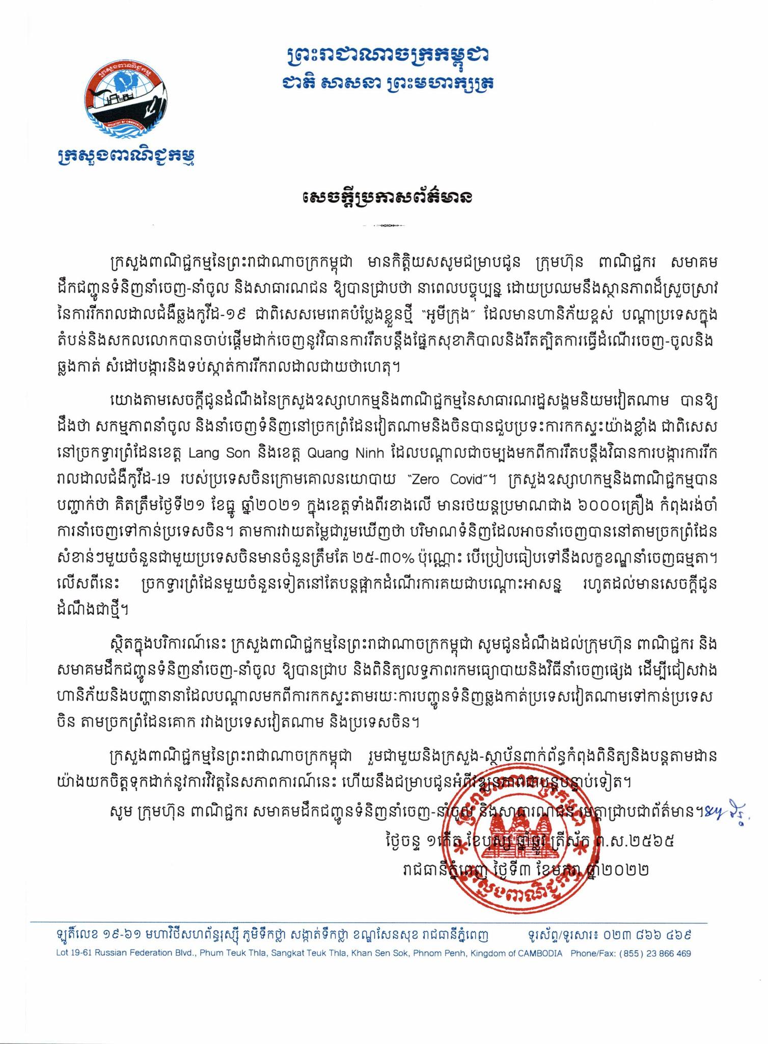 ក្រសួងពាណិជ្ជកម្ម កាលពីថ្ងៃទី ០៣ ខែមីនា ឆ្នាំ២០២២ បានចេញសេចក្ដីប្រកាសព័ត៌មាន ដើម្បីជម្រាបដល់ក្រុមហ៊ុន ពាណិជ្ជករ សមាគមន៍ដឹកជញ្ជូនទំនិញនាំចេញ-នាំចូល ឱ្យពិនិត្យរកមធ្យោបាយ និងវិធីនាំចេញផ្សេងពីការនាំចេញ ដឹកជញ្ជូនទំនិញនាំចេញ-នាំចូល ទំនិញឆ្លងកាត់ប្រទេសវៀតណាមទៅកាន់ប្រទេសចិន តាមច្រកព្រំដែនគោក រវាងប្រទេសវៀតណាម និងប្រទេសចិន។