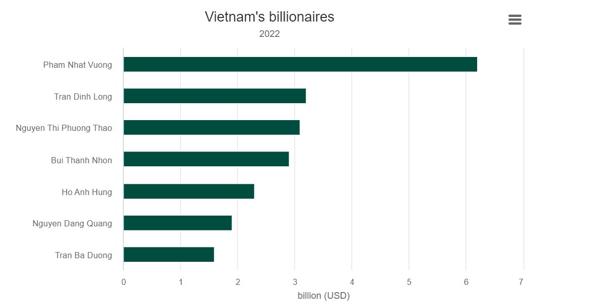 យោងតាមការចុះផ្សាយរបស់សារព័ត៌មាន vnexpres បានឱ្យដឹងថា មហាសេដ្ឋីវៀតណាមចំនួន ៧នាក់បានជាប់ចំណាត់ថ្នាក់ក្នុងបញ្ជីអ្នកមានបំផុតលើពិភពលោករបស់ទស្សនាវដ្ដី Forbes។ ជាមួយគ្នានេះ បើតាមការបង្ហាញបញ្ជីឈ្មោះ Forbes ឆ្នាំ២០២២ អ្នកមានបំផុតរបសវៀតណាមទាំង ៧នាក់នោះមានតម្លៃសរុប ២១.២ ពាន់លានដុល្លារ។