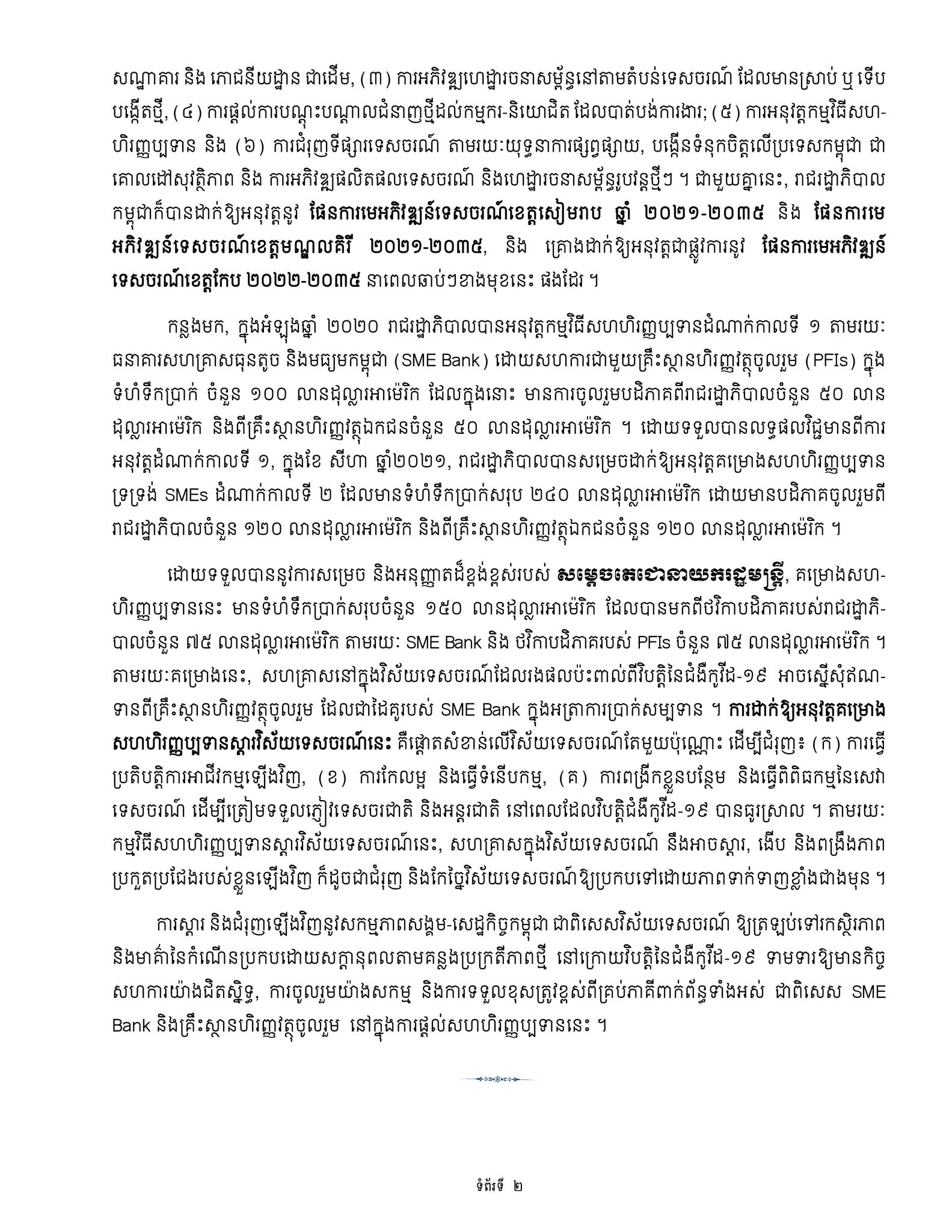 * ជំហានទី២ មានទឹកប្រាក់សរុប២៤០លានដុល្លារ ដើម្បីគាំទ្រដល់សហគ្រាសធុនតូច និងមធ្យមក្នុងការរក្សាលំនឹងអាជីវកម្ម និងបង្កើតការងារថ្មីក៏ដូចជា បង្កើនប្រាក់ចំណូលជូនប្រជាពលរដ្ឋ ក្នុងវិស័យអាទិភាពរួមទាំង វិស័យទេសចរណ៍ផងដែរ ដែលបានរងផលប៉ះពាល់ពី វិបត្តិនៃដោយជំងឺកូវីដ១៩។