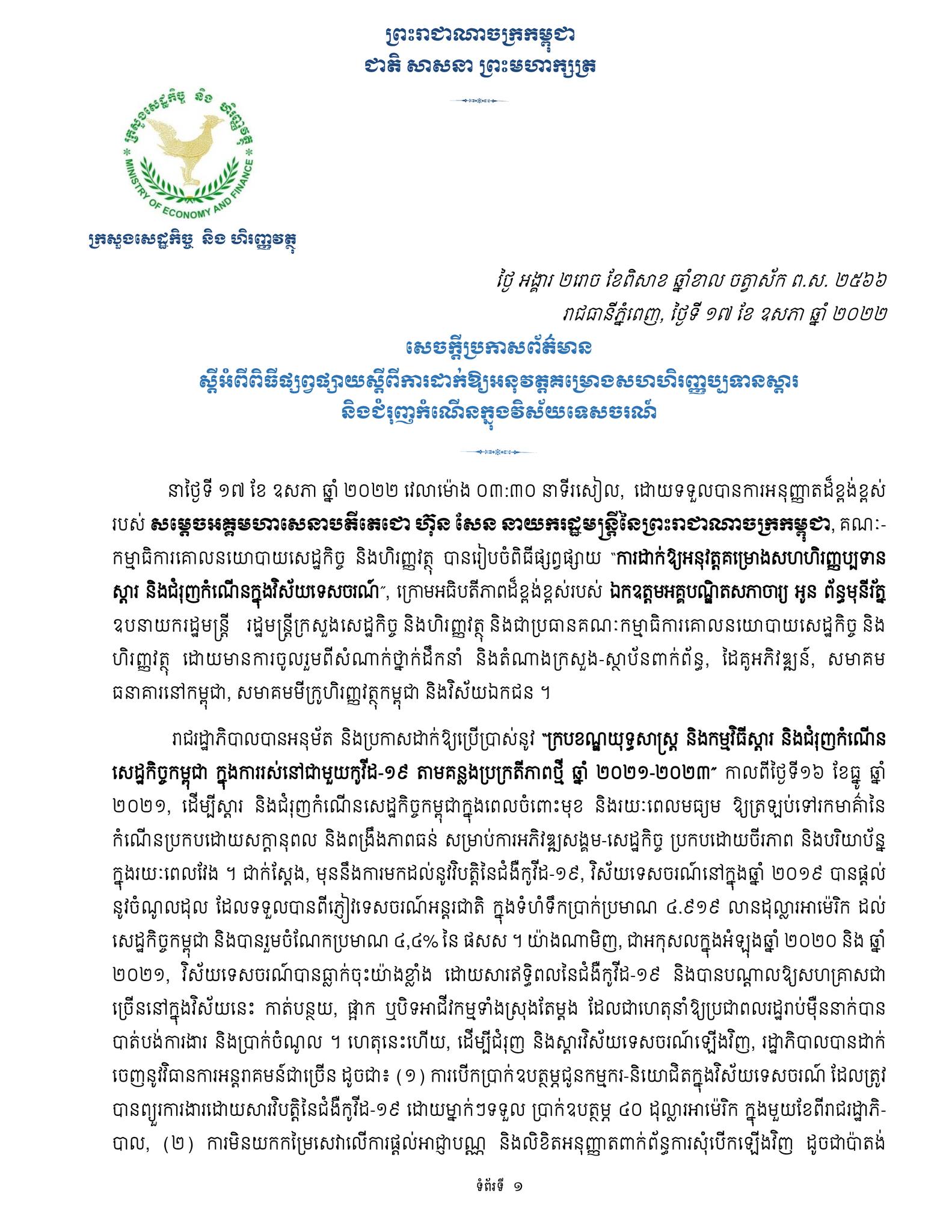 រាជរដ្ឋាភិបាលកម្ពុជា តាមរយៈក្រសួងសេដ្ឋកិច្ច និងហិរញ្ញវត្ថុ ប្រកាសបានដាក់ដំណើរការជាផ្លូវការ «គម្រោងសហហិរញ្ញបប្បទាន ស្ដារវិស័យទេសចរណ៍» ក្នុងកញ្ចប់ថវិកាចំនួន ១៥០លានដុល្លារអាមេរិក ដែលជាបដិភាគរវាងរាជរដ្ឋាភិបាល និងគ្រឹះស្ថានហិរញ្ញវត្ថុចូលរួម (PFIs)។